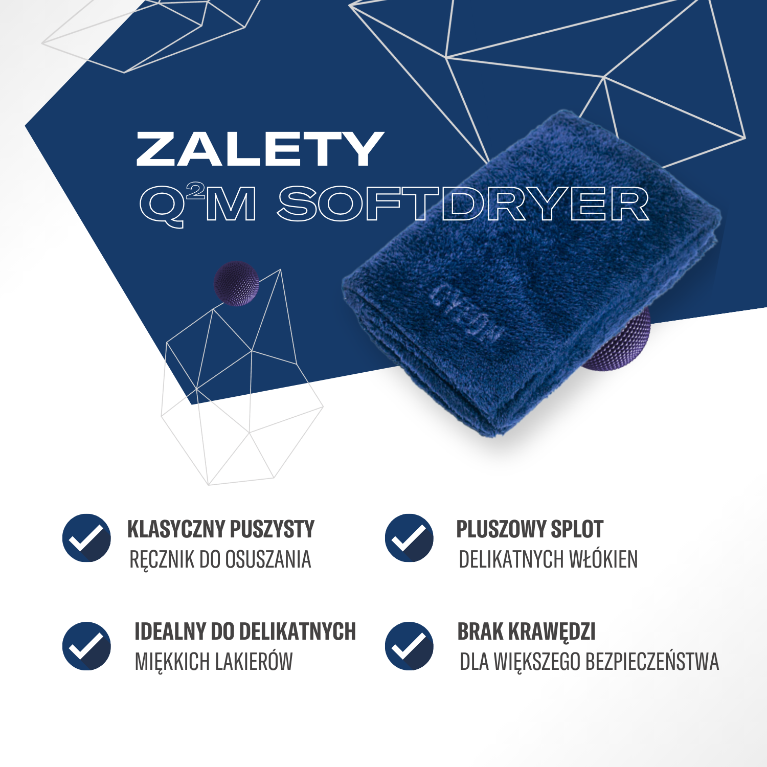 Q²M SoftDryer to nasz pomysł na alternatywę dla Q²M WaffleDryer. Jest bardzo bezpieczny i skuteczny, wchłaniając ogromne ilości wody. Największą zaletą Q²M Soft Dryer jest ekstremalna miękkość - zapewnia świetne osiągi, prześlizgując się po powierzchni lakieru. Dzięki technologii cięcia laserowego ma bezkrawędziowe wykończenie co redukuje ryzyko rysowania lakieru. Jesteśmy bardzo dumni mogąc zaprezentować Wam najbardziej miękki i jak dotychczas najskuteczniejszy sposób osuszania lakieru samochodowego.
